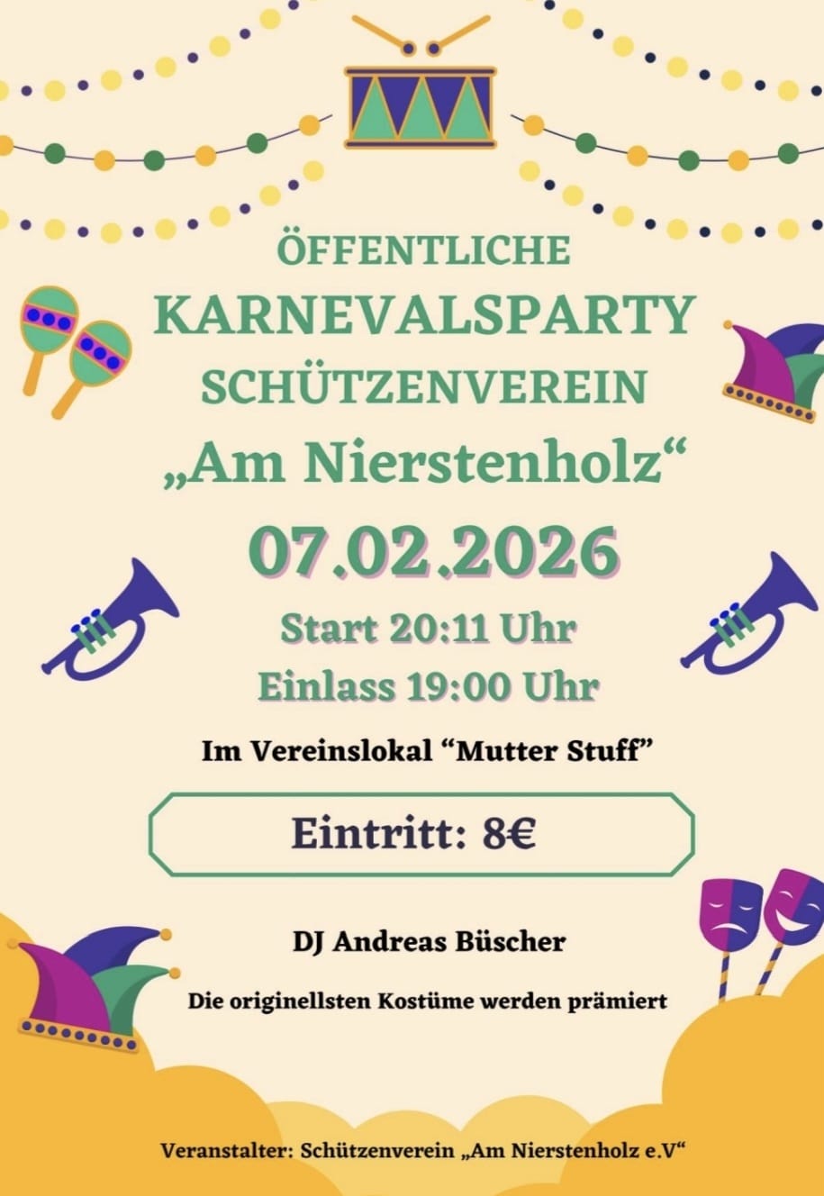Der Schützenverein „Am Nierstenholz“ lädt zur traditionellen Karnevalsparty ein. Gefeiert wird am Samstag, den 07.02. im Vereinslokal Mutter Stuff.